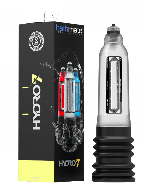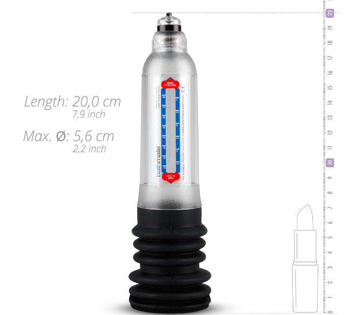 De Bathmate Hydro 7 Penispomp is een hydrotherapie pomp voor maximale penisvergroting! Je kunt deze penispomp gebruiken in bad of onder de douche en vullen met warm water. Door het creëren van een verhoogde bloedcirculatie zal deze penispomp jouw penis optimaal vergroten. Als je deze vult met warm water zal de penis nog groter en harder worden. Hoe meer je de penispomp gebruikt hoe sterker, groter en gezonder jouw penis zal gaan worden. Het resultaat is al zichtbaar na 1 sessie. Het is aangeraden om de penispomp maximaal 3 keer per week te gebruiken voor maximaal 20 minuten. De Hydro 7 penispomp is geschikt voor een erecte penis met een lengte van 13 tot 18 cm. Dit product mag niet op platforms (zoals Amazon, BOL) verkocht worden.